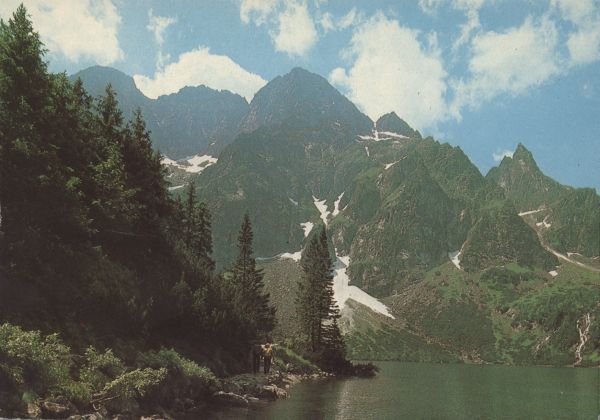 Fotografia barwna wykonana nad Morskim Okiem. Na zdjęciu szczyty otaczające jezioro: Mnich, Cubryna, Mięguszowieckie Szczyty.