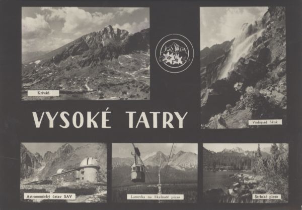 Pocztówka 5. elementowa. Na kolejnych zdjęciach przedstawiono: 1. Krywań, 2. Wodospad Skok, 3. Obserwatorium Astronomiczne Słowackiej Akademii Nauk w Dolinie Łomnickiej. 4. Kolej linową nad Łomnicki Staw, 5. Szczyrbskie Jezioro. W centralnej części napis: VYSOKÉ TATRY, powyżej logo Wysokich Tatr.