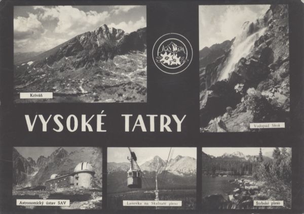 Pocztówka 5. elementowa. Na kolejnych zdjęciach przedstawiono: 1. Krywań, 2. Wodospad Skok, 3. Obserwatorium Astronomiczne Słowackiej Akademii Nauk w Dolinie Łomnickiej. 4. Kolej linową nad Łomnicki Staw, 5. Szczyrbskie Jezioro. W centralnej części napis: VYSOKÉ TATRY, powyżej logo Wysokich Tatr.