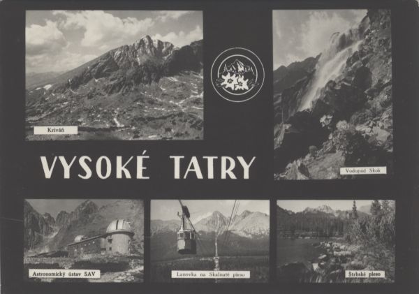 Pocztówka 5. elementowa. Na kolejnych zdjęciach przedstawiono: 1. Krywań, 2. Wodospad Skok, 3. Obserwatorium Astronomiczne Słowackiej Akademii Nauk w Dolinie Łomnickiej. 4. Kolej linową nad Łomnicki Staw, 5. Szczyrbskie Jezioro. W centralnej części napis: VYSOKÉ TATRY, powyżej logo Wysokich Tatr.