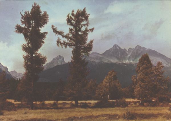 Widok z Kotliny Spiskiej na Pośrednią Grań i grupę Łomnicy. Na pierwszym planie drzewa.