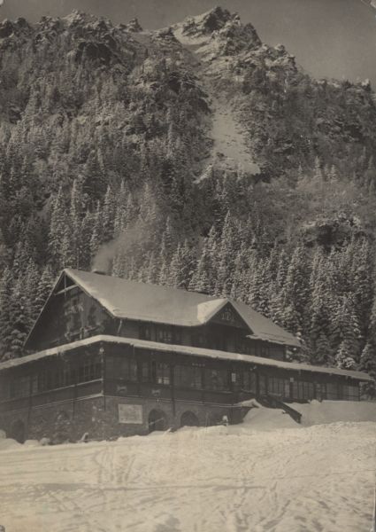 Widok na schronisko pod Kozicą w zimowej scenerii.