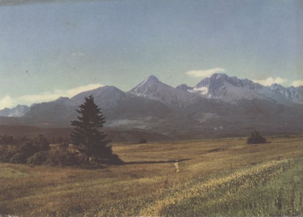 Panorama bocznej grani południowej czę¶ci Tatr Wysokich. Od lewej: Tępa, Kończysta, Batyżowiecki Szczyt i Gerlach. Na pierwszym planie podtatrzańskie ł±ki.