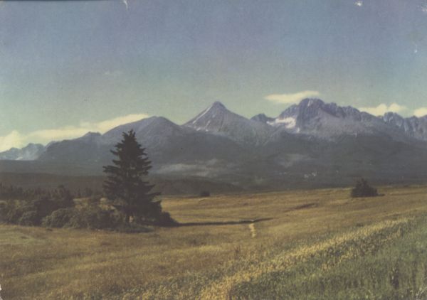 Tatrzański Park Narodowy [Słowacja]. Od lewej: Tępa, Kończysta, Batyżowiecki Szczyt, Gerlach. Tytuł również w języku: ros., ang., niem.