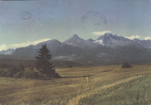 Tatrzański Park Narodowy [Słowacja]. Od lewej: Tępa, Kończysta, Batyżowiecki Szczyt, Gerlach. Tytuł również w języku: ros., ang., niem.