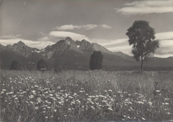 Widok na Pośrednią Grań i grupę Łomnicy. Na pierwszym planie łąka.