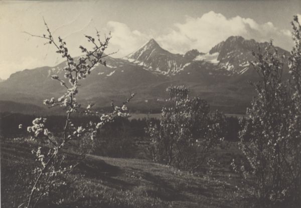 Widok z Mięguszowiec na Osterwę, Tęp±, Kończyst±, Batyżowiecki Szczyt i Gerlach. Na pierwszym planie kwitn±ce drzewa.
