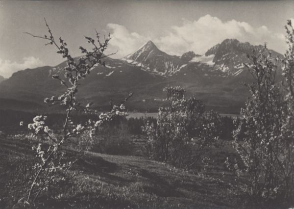 Widok z Mięguszowiec na Osterwę, Tęp±, Kończyst±, Batyżowiecki Szczyt i Gerlach. Na pierwszym planie kwitn±ce drzewa.