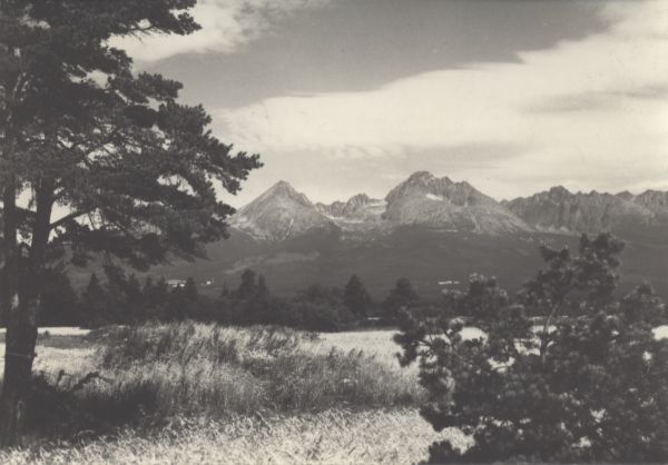 Widok na boczną grań Tatr Wysokich z południa. Od lewej: Kończysta, Batyżowiecki Szczyt, Gerlach i Staroleśna. Na pierwszym planie drzewo - sosna (Pinus L.).