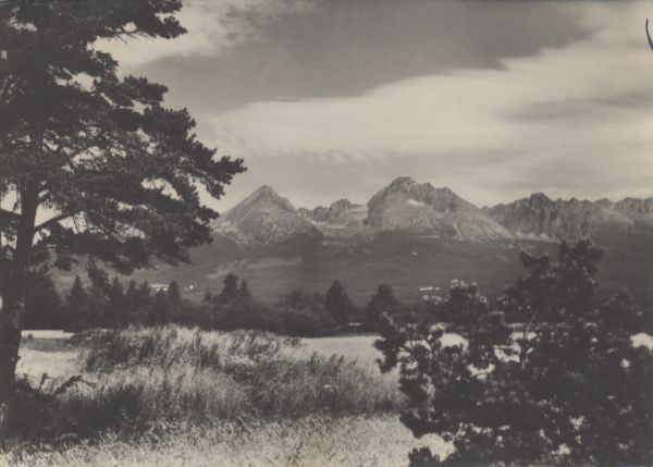 Widok na boczną grań Tatr Wysokich z południa. Od lewej: Kończysta, Batyżowiecki Szczyt, Gerlach i Staroleśna. Na pierwszym planie drzewo - sosna (Pinus L.).