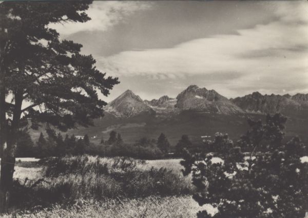 Widok na boczną grań Tatr Wysokich z południa. Od lewej: Kończysta, Batyżowiecki Szczyt, Gerlach i Staroleśna. Na pierwszym planie drzewo - sosna (Pinus L.).