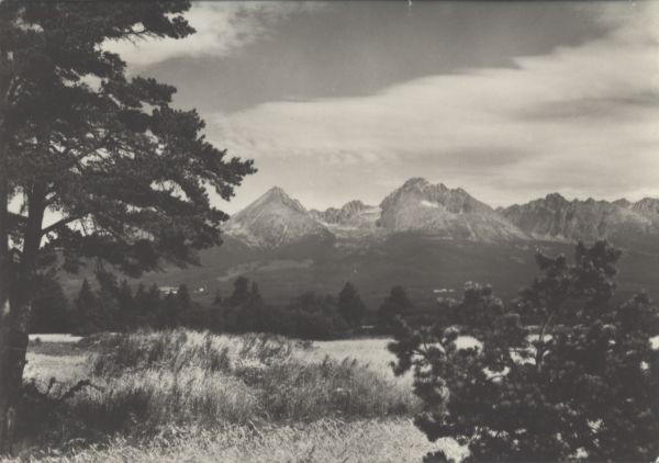 Widok na boczną grań Tatr Wysokich z południa. Od lewej: Kończysta, Batyżowiecki Szczyt, Gerlach i Staroleśna. Na pierwszym planie drzewo - sosna (Pinus L.).