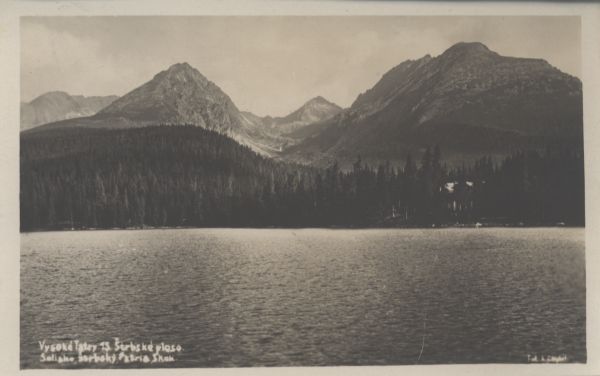 Widok na Szczyrbskie Jezioro. W tle Solisko, Szczyrbski Szczyt i Skrajna Baszta. Na dole po lewej stronie wpisany tytuł, po prawej fotograf.