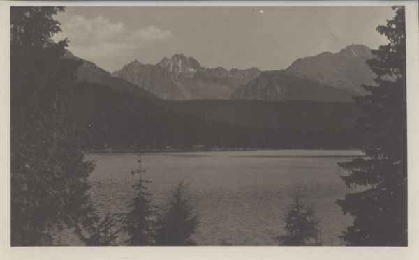 Widok na Szczyrbskie Jezioro i otaczający je las. W tle szczyty: Kopa Popradzka, Wysoka, Osterwa, Tępa, Kończysta.