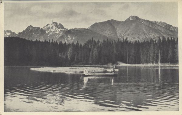 Widok na Szczyrbskie Jezioro i jego otoczenie. Na pierwszym planie kajak. W tle szczyty: Kopa Popradzka, Wysoka, Osterwa, Tępa, Kończysta.