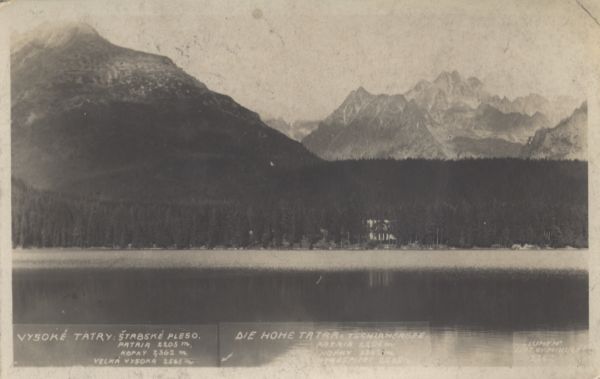 Widok na Szczyrbskie Jezioro i jego otoczenie. W tle szczyty: Skrajna Baszta, Kopa Popradzka i Wysoka. Na dole wpisany tytuł pocztówki, również w języku niemieckim oraz producent.