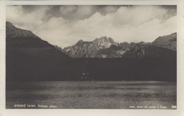 Widok na Szczyrbskie Jezioro i jego otoczenie. W tle szczyty: Popradzka Kopa, Wysoka i Osterwa. Na dole wpisany tytuł pocztówki i nakładca.