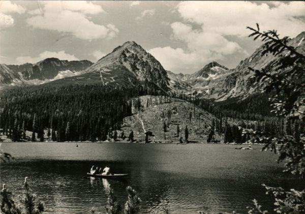 Łodzie na Szczyrbskim Jeziorze. W tle Ostra, Szczyrbskie Solisko, Szczyrbski Szczyt i grań Baszt. Pod Skrajnym Soliskiem widoczna skocznia narciarska.