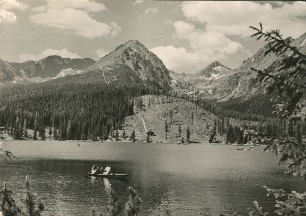 Łodzie na Szczyrbskim Jeziorze. W tle Ostra, Szczyrbskie Solisko, Szczyrbski Szczyt i grań Baszt. Pod Skrajnym Soliskiem widoczna skocznia narciarska.