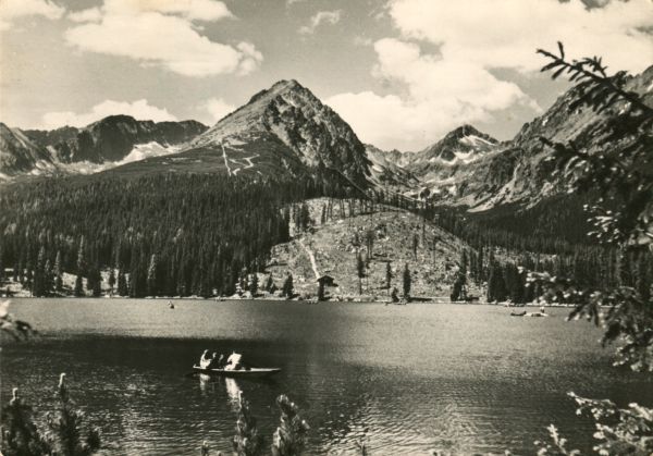 Łodzie na Szczyrbskim Jeziorze. W tle Ostra, Szczyrbskie Solisko, Szczyrbski Szczyt i grań Baszt. Pod Skrajnym Soliskiem widoczna skocznia narciarska.