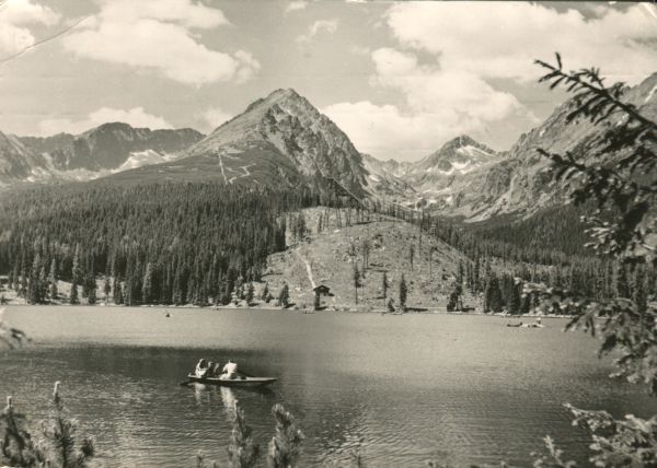 Łodzie na Szczyrbskim Jeziorze. W tle Ostra, Szczyrbskie Solisko, Szczyrbski Szczyt i grań Baszt. Pod Skrajnym Soliskiem widoczna skocznia narciarska.
