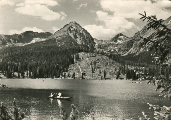Łodzie na Szczyrbskim Jeziorze. W tle Ostra, Szczyrbskie Solisko, Szczyrbski Szczyt i grań Baszt. Pod Skrajnym Soliskiem widoczna skocznia narciarska.