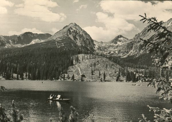 Łodzie na Szczyrbskim Jeziorze. W tle Ostra, Szczyrbskie Solisko, Szczyrbski Szczyt i grań Baszt. Pod Skrajnym Soliskiem widoczna skocznia narciarska.