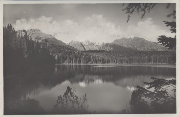 Widok na Szczyrbskie Jezioro, w głębi las. W tle od lewej strony szczyty: grań Baszt ze Skrajn± Baszt±, Kopa Popradzka, Wysoka, Tępa i Kończysta. Z przodu Osterwa.