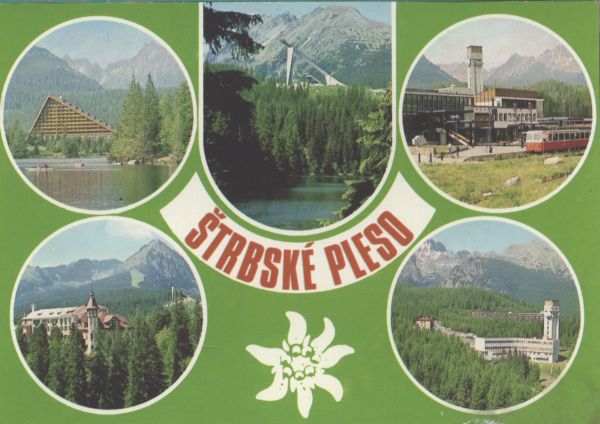 Widok na Wysoką, Ganek, Rumanowy Szczyt, Żłobisty Szczyt i Tępą. W centrum napis: ŠTRBSKÉ PLESO, pod nim rysunek szarotki.