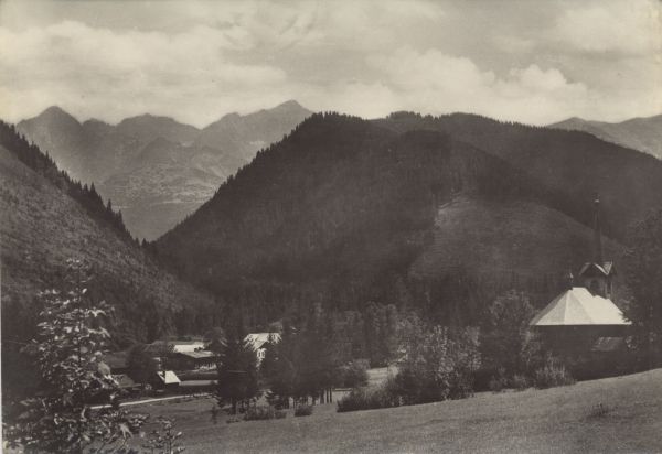 Widok na Jaworzynę. Na pierwszym planie zabudowania, po prawej stronie kościółek ufundowany przez Christiana Hohenlohe.