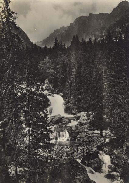 Wodospady Zimnej Wody w Dolinie Zimnej Wody. Na pierwszym planie mostek, w tle las i masyw Łomnicy.