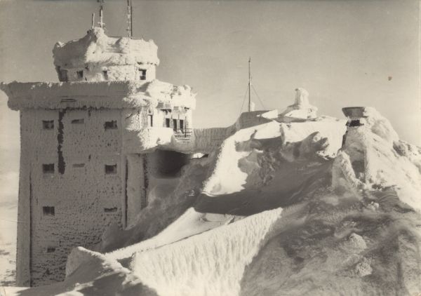 Widok na za¶nieżony budynek stacji kolei linowej na wierzchołku Łomnicy.