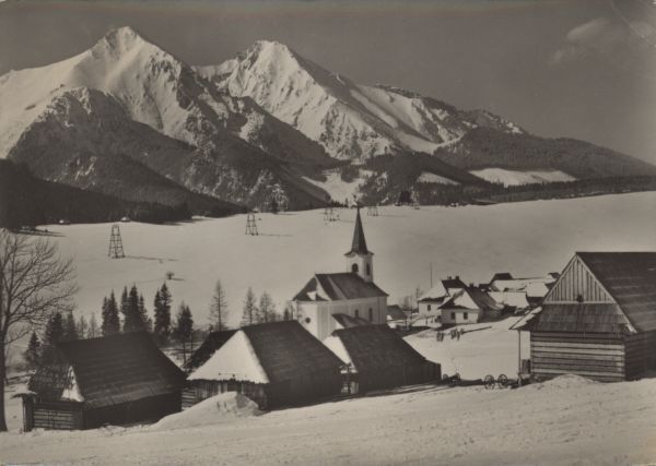 Widok na Zdziar. Na pierwszym planie zabudowania wiejskie i kościół w scenerii zimowej. W tle Płaczliwa Skała i Hawrań.