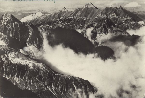 Widok z Łomnicy na otoczone chmurami szczyty Tatr Wysokich. W tyle Tatry Bielskie, od lewej: Murań, Nowy Wierch, Hawrań i Płaczliwa Skała.