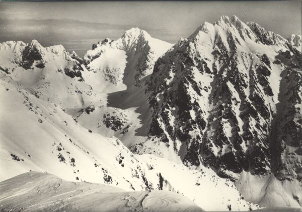 Tatry Wysokie. Wołowa Turnia (z lewej), Żabi Koń, Rysy, Wysoka, Kopa Popradzka.
