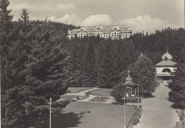 Widok z Tatrzańskiej Łomnicy. Na pierwszym planie park, w którym odpoczywają wczasowicze. W tle Grand Hotel Praga otoczony lasem.