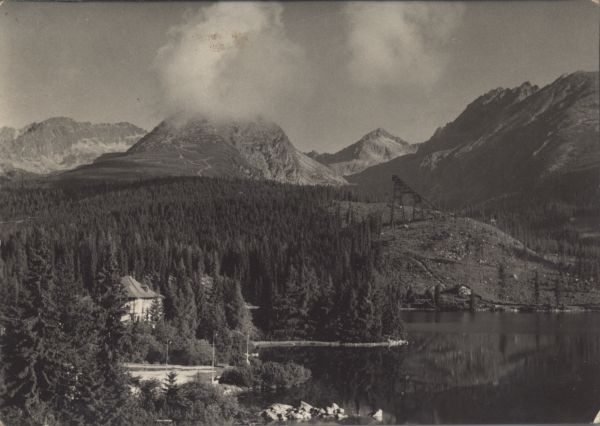 Widok na Szczyrbskie Jezioro i jego otoczenie. W tle szczyty, od lewej: Ostra, Szczyrbskie Solisko, Szczyrbski Szczyt i grań Baszt ze Skrajn± Baszt±. Pod Szczyrbskim Szczytem widoczna skocznia narciarska.
