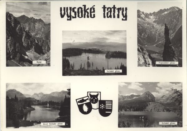 Widok na Szczyrbskie Jezioro, w tle Szczyrbskie Solisko. W górnej części pocztówki napis: vysoké tatry, a w dolnej herby 3 miejscowości.
