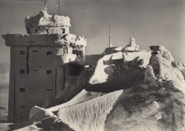 Widok na zaśnieżony budynek stacji kolei linowej na wierzchołku Łomnicy.