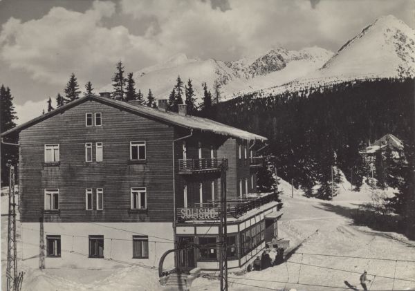 Widok na budynek sanatorium dla dzieci w Szczyrbskim Jeziorze Solisko w scenerii zimowej. W tle Krywań, Siodełkowa Kopa, Ostra i Wielkie Solisko.