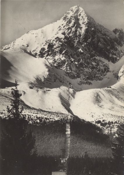 Widok na Łomnicę i trasę kolei linowej na szczyt w scenerii zimowej. Na pierwszym planie stacja początkowa w Tatrzańskiej Łomnicy, wyżej stacja pośrednia nad Łomnickim Stawem.