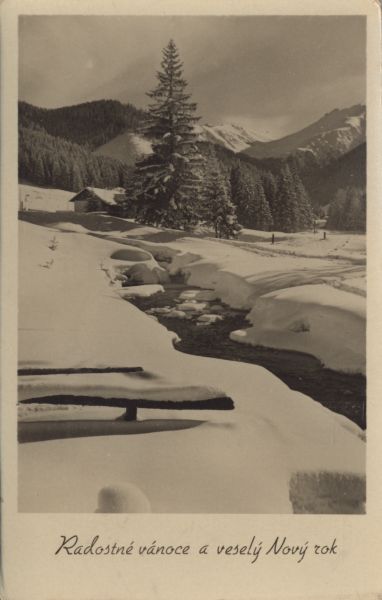 Zimowy pejzaż z Jaworzyny Spiskiej. Na pierwszym planie potok, w tle szałas, las i szczyty. Pod zdjęciem życzenia: Radostné vánoce a veselý Nový rok.