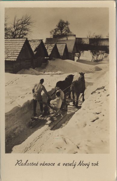 Wieś podtatrzańska zimą. 3 górali na saniach zaprzęgniętych w 2 konie. W tle zabudowania wiejskie. Pod zdjęciem życzenia: Radostné vánoce a veselý Nový rok.