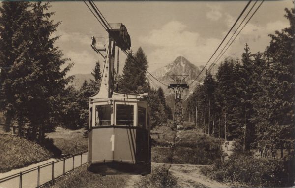 Tatrzańska Łomnica. Dolna stacja kolei linowej na Łomnicę. Wagonik kolejki. W tle Łomnica.