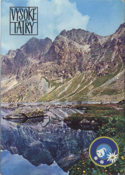 Dolina Mięguszowiecka. Widok znad Wielkiego Stawu Hińczowego na Wielki Mięguszowiecki Szczyt (z lewej), Po¶redni Mięguszowiecki Szczyt i Mięguszowieck± Przełęcz pod Chłopkiem. U góry po lewej stronie napis: VYSOKÉ TATRY, na dole po prawej logo miasta VYSOKÉ TATRY.