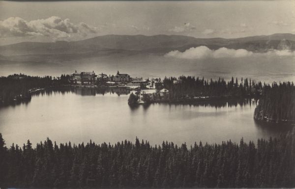 Szczyrbskie Jezioro z hotelami nad brzegiem. W tle Niżne Tatry.