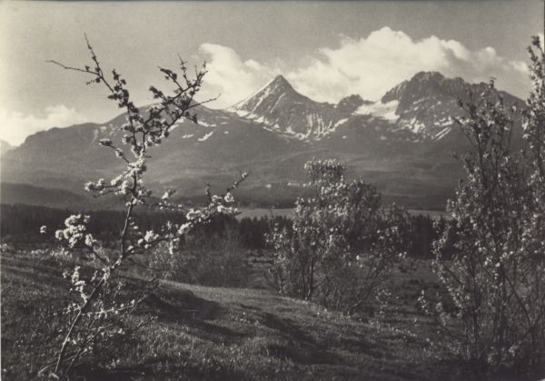 Widok z Mięguszowiec na Osterwę, Tęp±, Kończyst±, Batyżowiecki Szczyt i Gerlach. Na pierwszym planie kwitn±ce drzewa.