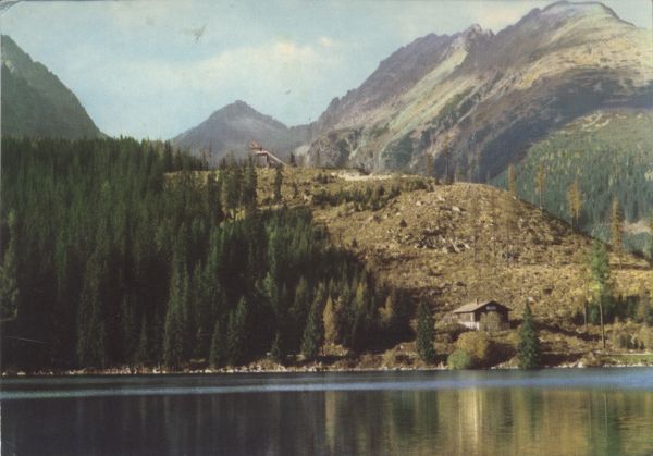 Tatry Wysokie - Szczyrbskie Jezioro. Szczyrbskie Jezioro i wej¶cie do Doliny Młynickiej ze Szczyrbskim Szczytem i Skrajn± Baszt±. Tytuł również w j. niem., ang., fr.