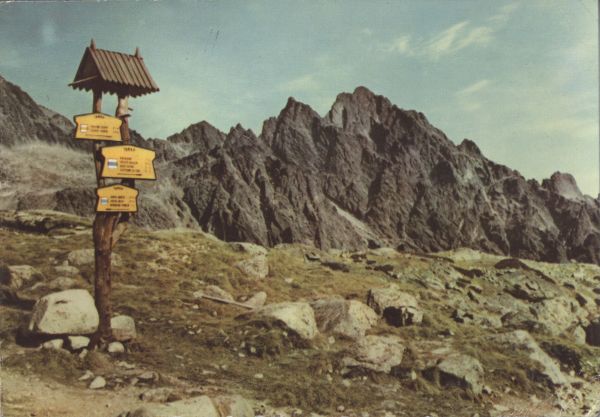 Widok z Doliny Staroleśnej na Pośrednią Grań i Żółty Szczyt. Na pierwszym planie szlak i kierunkowskaz turystyczny.