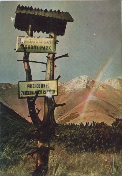 Widok na Skrajne Jatki. Na pierwszym planie słup informacyjny, za nim kosodrzewina (Pinus mugo Turra). Po prawej stronie widoczna tęcza.